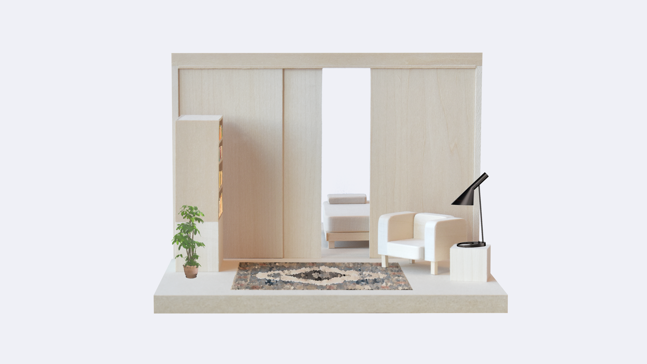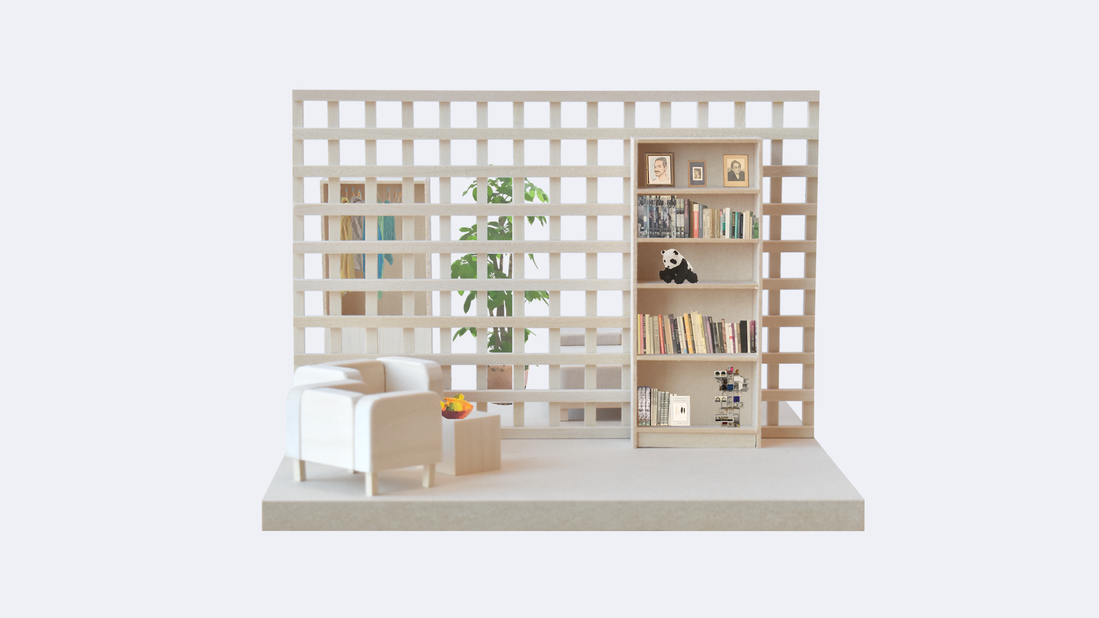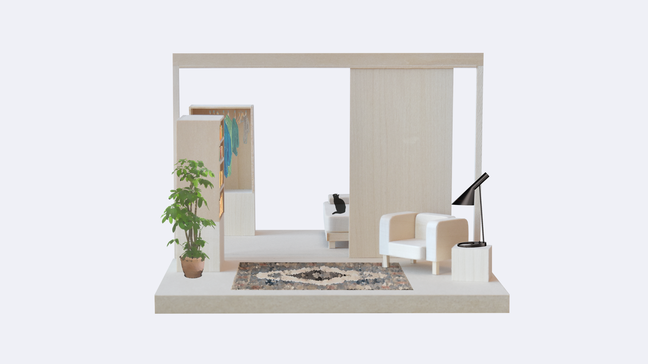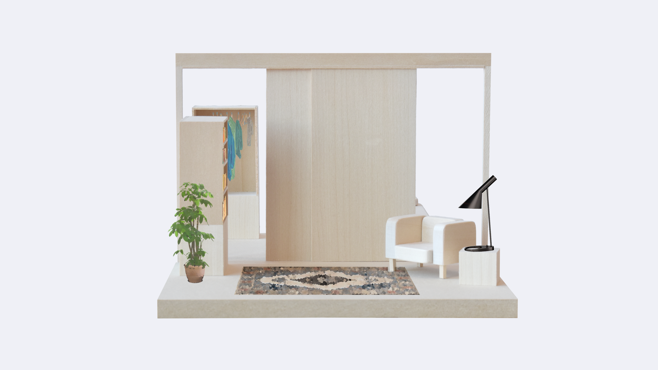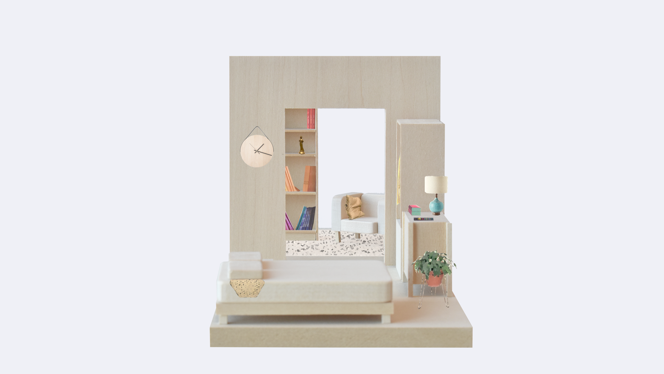 Prior to the midreview, my focus was on studying how we make a home for ourselves through elements not considered traditionally in the realm of architecture: partitions, furniture, and objects. The models were a way of tracking how our definitions may change over time.