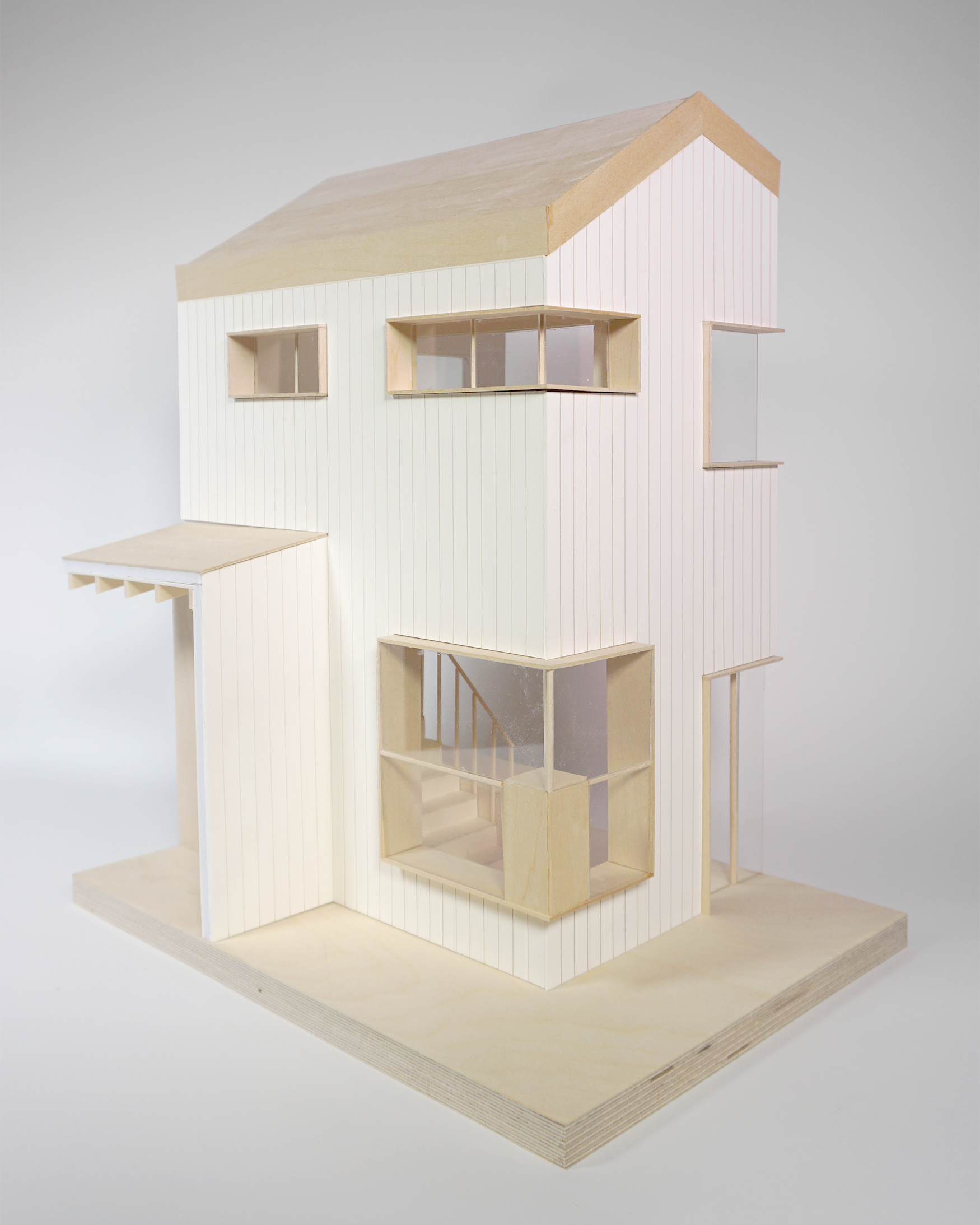 The Hill is a struggling neighborhood south of New Haven’s downtown. Through decades of underinvestment, many homes have been demolished, leaving empty non-conforming lots along many streets. The site is two such lots combined to allow for a two-family home. The tight budget of the project meant a small footprint and the home needed to fit within a streetscape of varyingly sized houses and triple deckers.